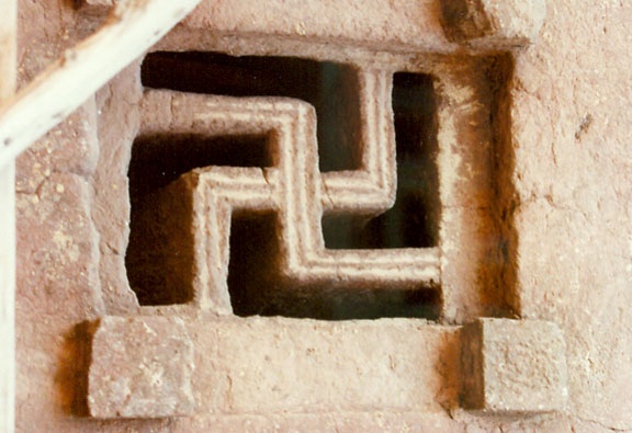 نماد گردونه خورشید در پنجره ی کلسیای لالیبا راک هن در اتیوپی
