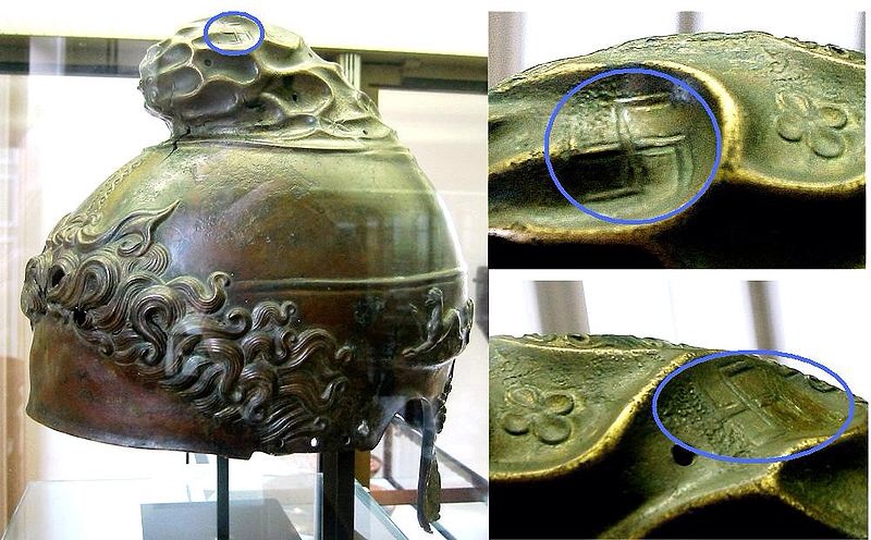 کلاهخود یونانی که علامت چلبپای شکسته در بالای آن نقش بسته است.مربوط به ۳۲۵ تا ۳۵۰ سال قبل از میلاد مسیح